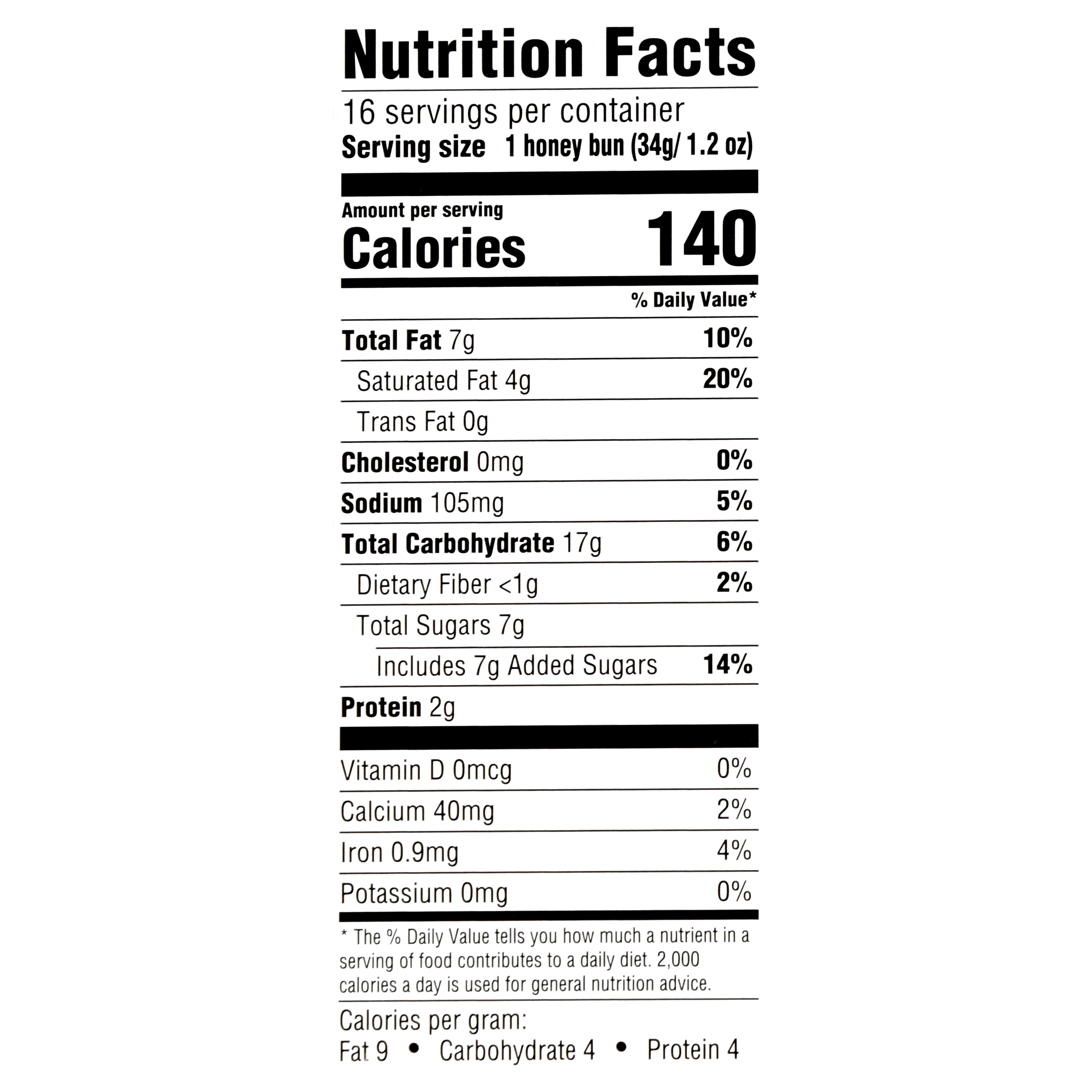 Little Debbie Iced Honey Bun - Shop Snacks & Candy at ... Little Debbie Iced Honey Bun ; Sodium, 360mg, 15% ; Potassium, 120mg, 3% ; Total Carbohydrate, 63g, 21% ; Dietary Fiber, 1g, 4% ...