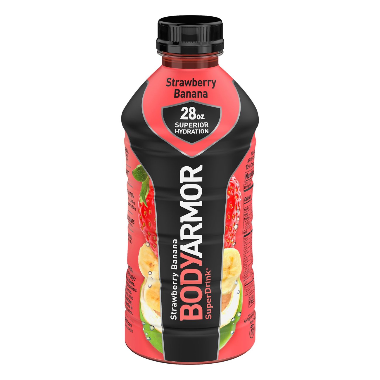 Calories in BodyArmor Strawberry Banana (16 oz) and Nutrition Facts BodyArmor Strawberry Banana (16 oz) Nutrition Facts Serving Size 1 bottle (16 oz) Amount Per Serving Calories 120 % Daily Values* Total Fat 0.00g 0% Saturated Fat 0.000g 0% Trans Fat 0.000g Cholesterol 0mg 0% Sodium 40mg 2% Total Carbohydrate 28.00g 10% Dietary Fiber 0.0g 0% Sugars 28.00g Includes 26.00g Added Sugars 52% Protein 0.00g Vitamin D -