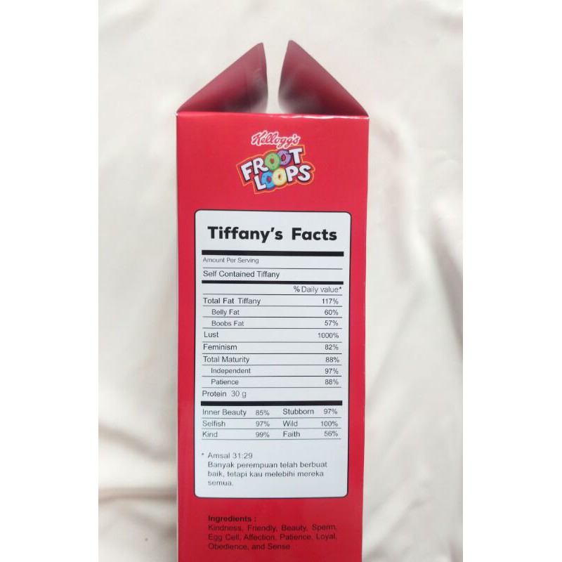 Fruit Loops Cereal Nutrition Facts - All Menu Price Fruit Loops Cereal - Nutrition Facts. Nutrition Facts. Serving Size: 1. container. Amount Per Serving. Calories 80 % Daily Value * 1% Total Fat 0.5 g grams. 0% Saturated Fat 0 g grams. Trans Fat 0 g grams. 0% Cholesterol 0 mg milligrams. 4% Sodium 100 mg milligrams. 6% Total Carbohydrates 18 g grams. 8% Dietary Fiber 2 g grams.