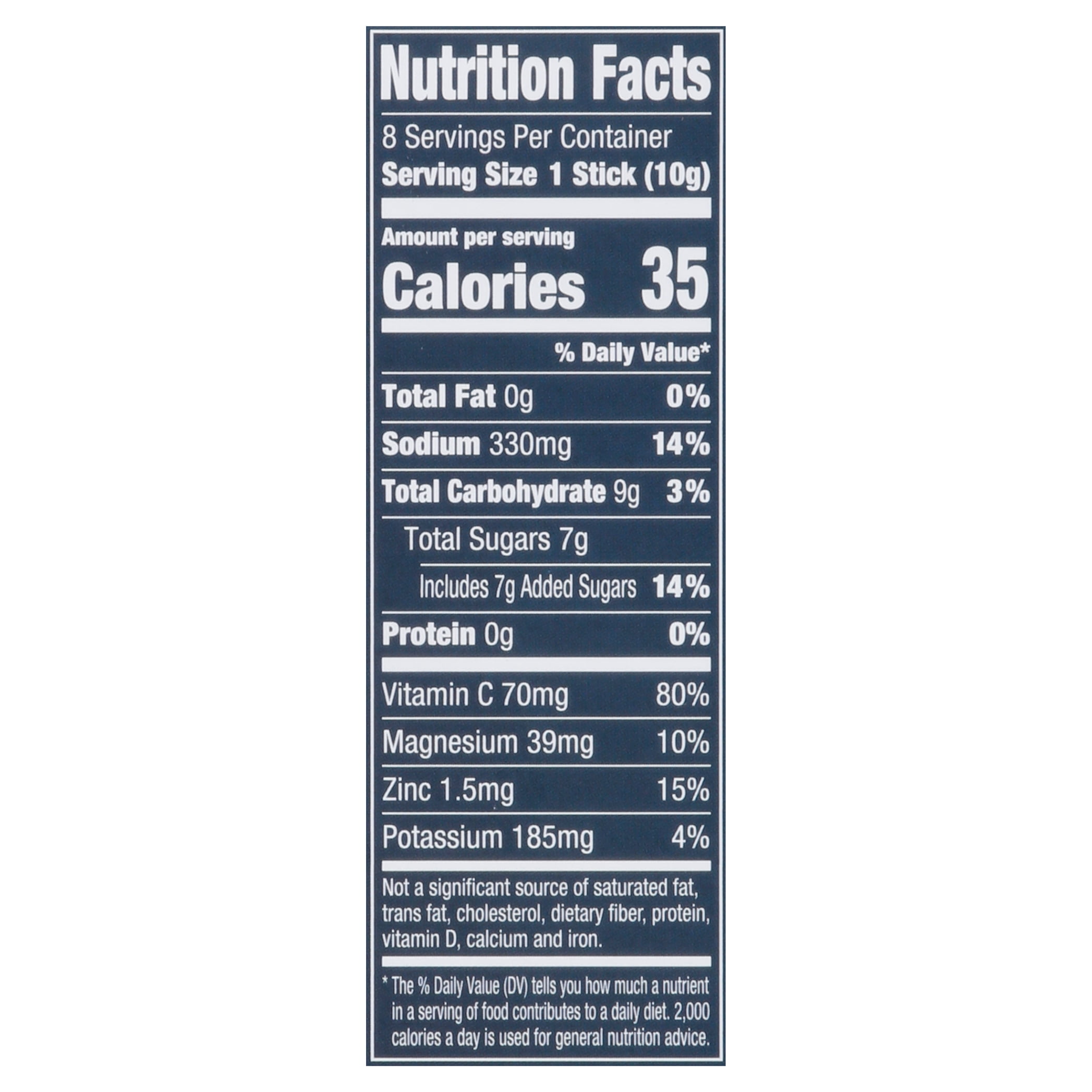 DripDrop Review - The Most Potent Electrolyte Drink Mix? | Coach Levi Most importantly, DripDrop contains essential electrolytes - sodium, potassium, and magnesium - plus zinc and glucose, which aid the re-hydration process. Nutrition Facts Per 1 stick: Calories 35 Sodium 330mg Potassium 185mg Total Carbs 9g Sugar 7g Protein 0g Vitamin C 70mg Magnesium 39mg Zinc 1.5mg