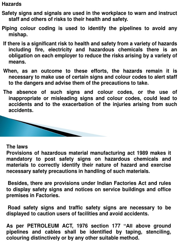 Hazard color codes. Know your OSHA and ANSI safety color codes for all hazards Fluorescent Orange/Orange-Red = Biological Hazard. These signs and tags have lettering or symbols in a contrasting color (usually black). This color designates infectious agents and wastes that pose a risk of death, injury, or illness. Fluorescent Yellow-Orange triangle with Dark Red border These signs designate slow moving vehicles. What are OSHA Color Codes? - Safety Sign For the identification of specific physical hazards including falling, tripping, and striking, and for designating caution. In OSHA standard 1910.145, specific colors are not mandated for use on accident prevention tags, but these colors are recommended: Red: for danger tags. Yellow: for caution tags. Orange: for warning tags. GHS Classification - PubChem 1. Globally Harmonized System of Classification and Labelling of Chemicals (GHS Rev. 9, 2021) 2. UNECE GHS (Rev.8) (2019) 3. UNECE GHS (Rev.7) (2017) Note: This page provides the current GHS summary. Obsolete H-codes and P-codes are also provided, as they are still in use but annotated as obsolete. For more information, please see the References. OSHA Color Codes for Chemical Storage | SPC Industrial Here is a breakdown of OSHA-approved color-coding for chemical storage: [Red] Flammability is the ability of a chemical to burn or ignite, causing fire or combustion. [Blue] A Health Hazard is any chemical that can pose a threat to an individual's physical health. [Yellow] Instability hazards are susceptible to dangerous decomposition. [White ...