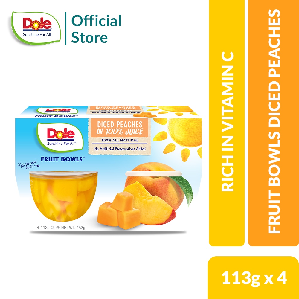 Diced Peaches with No Sugar Added 16oz - Dole® Sunshine And there's no sugar added because they're packed in water with the sweetness of monk fruit extract. Each serving contains 30 Calories 0g Saturated Fat 0mg Sodium 5g Sugars Full Nutrition Info Nutrition Information Servings Serving size 1 Container (113 g) Servings per container 4 Ingredients