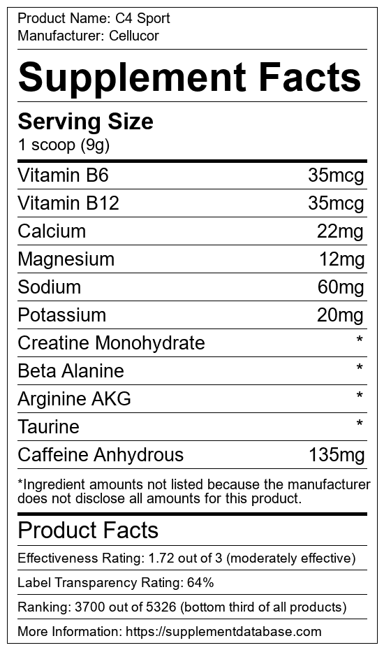 Why C4 Pre Workout F*cking Sucks (And What to Take Instead) C4 Pre Workout Ingredients. With that in mind, let's take a look at the ingredient lineup found in C4. According to the label, one scoop of C4 contains 1.5 grams of beta-alanine, a gram of creatine nitrate, a gram of arginine AKG, and a 741mg "explosive energy blend," whatever the hell that means.