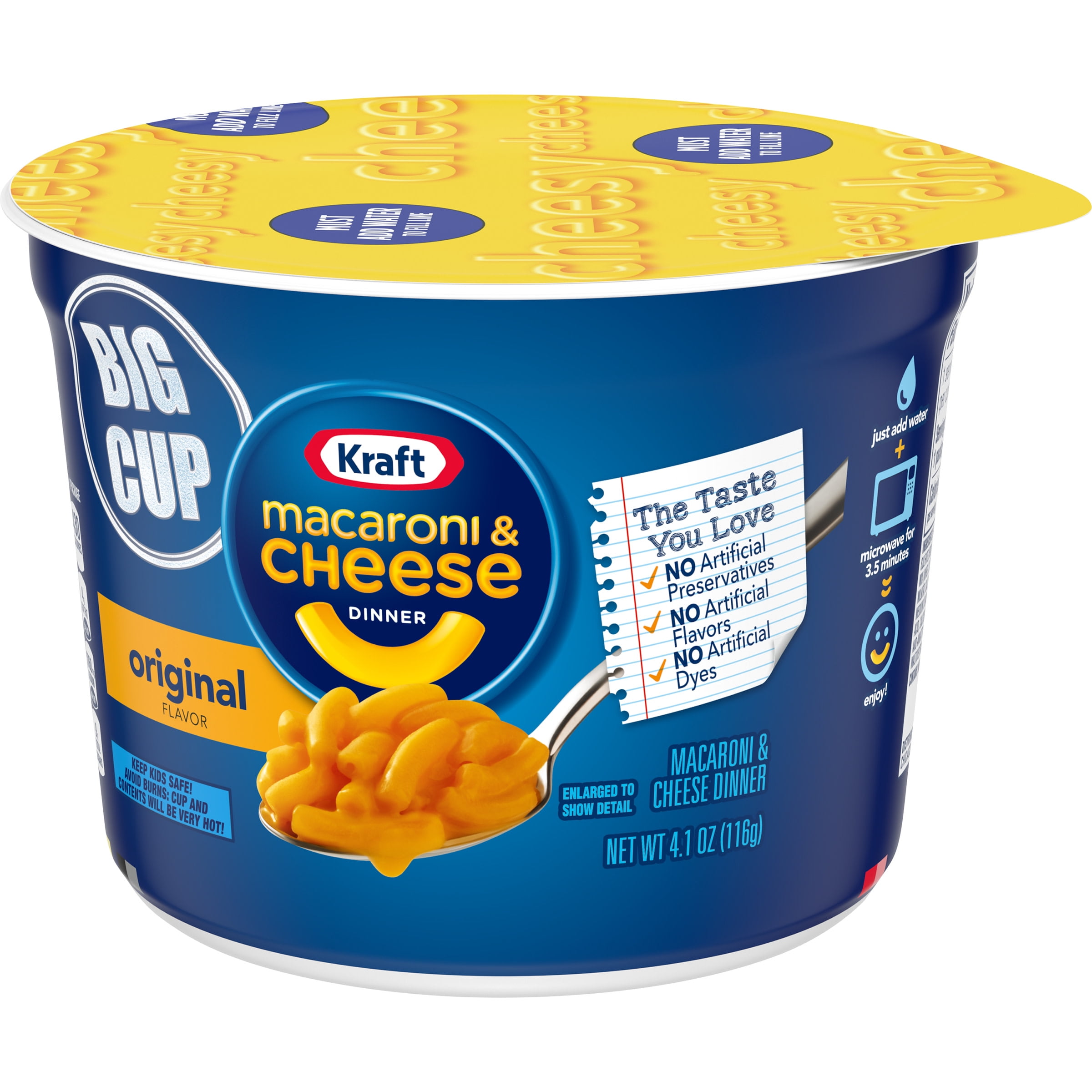Kraft Easy Mac Original Flavor Macaroni & Cheese Dinner Kraft Original Macaroni & Cheese Dinner Cup is easy and ready in just minutes. Kids and adults love the delicious taste and creamy texture of macaroni pasta with cheesy goodness. ... Calories: 220 % Daily Value* Total Fat 3.5 g 4%. Saturated Fat 2 g 10%. Trans Fat 0 g. Cholesterol 5 mg 2%. ... Always loved the original Kraft Mac and cheese the ...