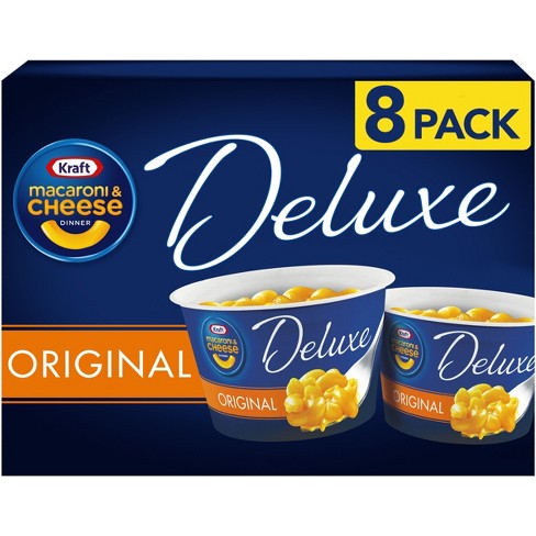Calories in Kraft Deluxe Original Cheddar Macaroni & Cheese and ... 10g. Carbs. 42g. Protein. 11g. There are 310 calories in 1 cup (3.5 oz) of Kraft Deluxe Original Cheddar Macaroni & Cheese. Calorie breakdown: 30% fat, 56% carbs, 15% protein.