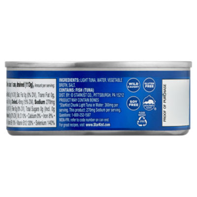 StarKist Chunk Light Tuna in Water - Shop Canned & Dried Food at H-E-B StarKist® Chunk Light Tuna in Water (Can) is carefully packed and cooked to preserve the naturally mild, trusted tuna flavor people have come to expect from StarKist®. Refreshing in cool tuna salads and hot casseroles. Ingredients Light Tuna, Water, Vegetable Broth, Salt. Safety warning, Contains: Fish (Tuna). Product may contain bones.