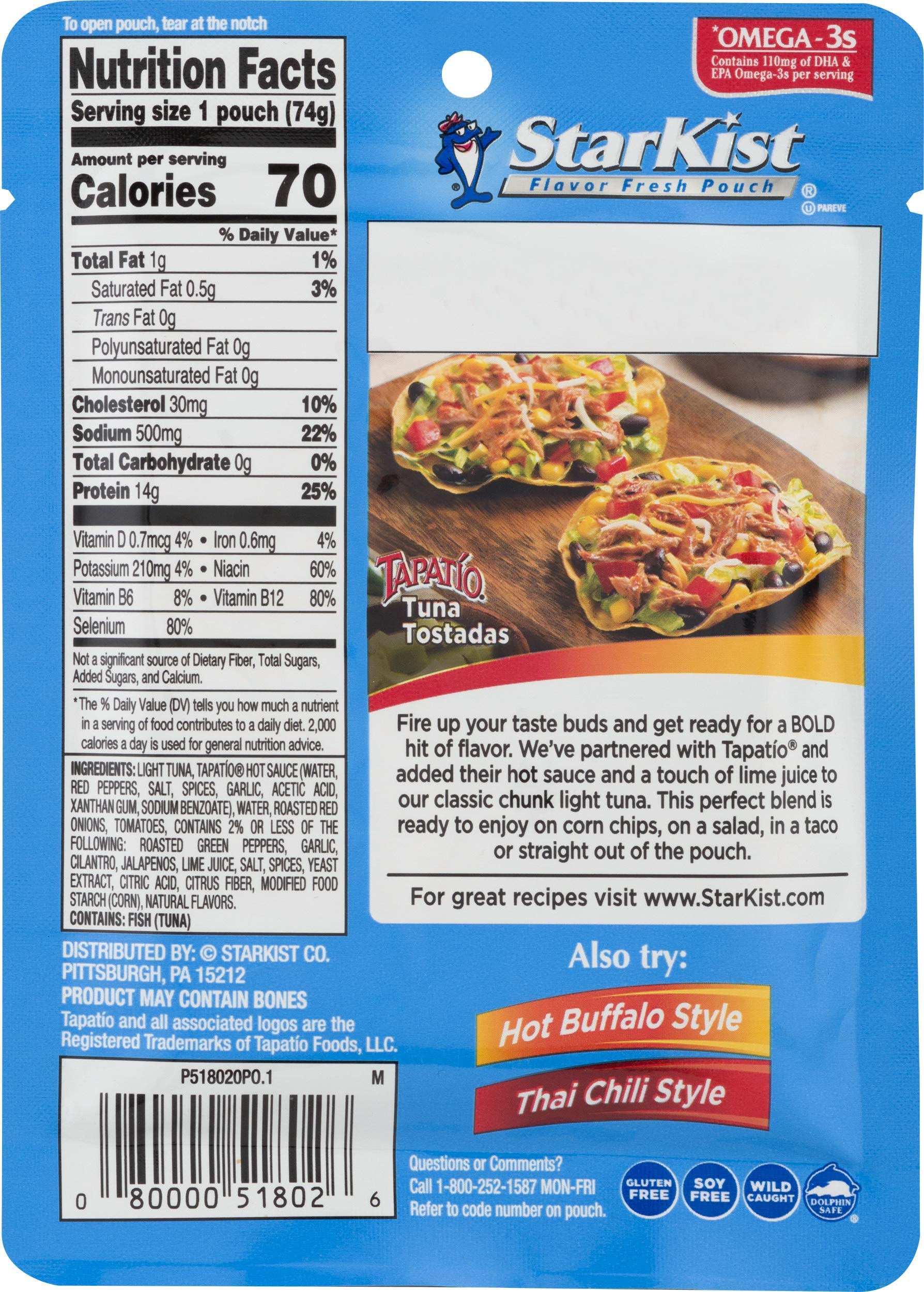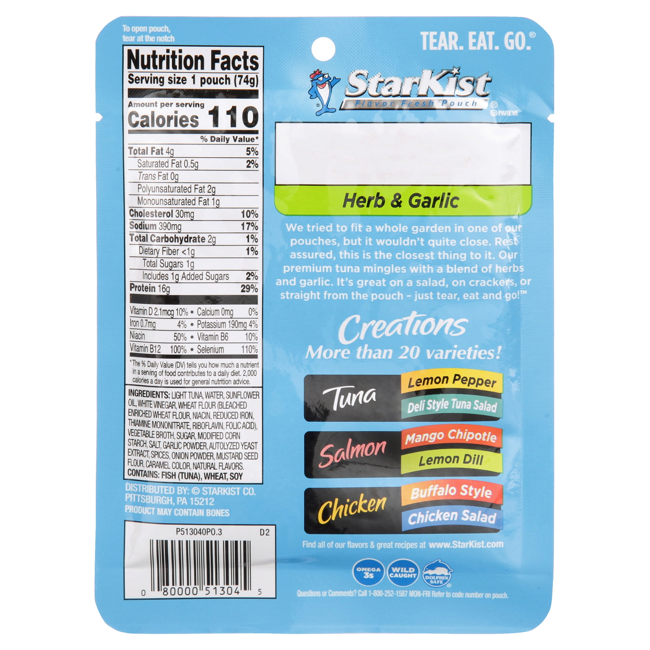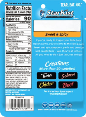 StarKist Chunk Light Tuna in Water, 3 Ounce (Pack of 8) StarKist tuna in water is a great and easy way to add seafood to your diet. Plus, these tuna cans have an EZ-Open lid and require no draining! ... *See label for complete nutritional information. Wild Caught . StarKist tuna and salmon is wild caught and are a great option to incorporate more seafood into your active lifestyle. Our nutrient ...