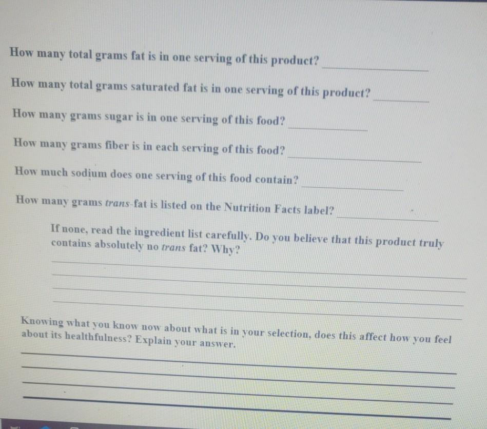 Food Label Worksheet .pdf - Hazel Hicks-Wyatt Spring... what you will need • this worksheet • a food package that includes nutrient claims, nutrition facts, and a list of ingredients • a handout that includes criteria for specific nutrient claims (i.e., low sugar, reduced sodium, etc.) food item: better oats classic - instant oatmeal with flaxseed how many servings are in this package? 10 what is the … Food Labels and Nutrition Claims - Worksheet(1).docx - Food... Food Labels and Nutrition Claims - Worksheet Instructions Select this link to the Required Reading web page:Understanding a food label. Use that web page to research the answers to the questions below. (Do not use Google.) 1. Read the paragraphs Food Labelling in Canadaand How to read a food label. Label Claims for Conventional Foods and Dietary Supplements there are three ways in which fda exercises its oversight in determining which health claims may be used on a label or in labeling for a conventional food or dietary supplement: 1) the 1990...