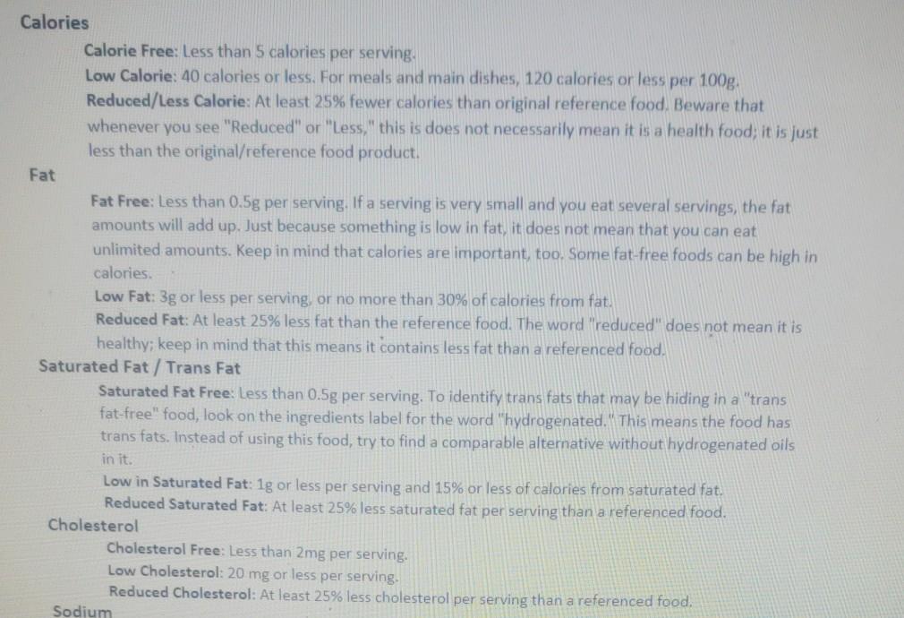 6 Free Printable Food Labels Worksheet & Different Types This food labels worksheet is designed to help students understand the basics of reading food labels. The labels provide important information about the ingredients, nutrients, allergens, and additives. This is a great resource for anyone who wants to make healthier choices when shopping for groceries. How do I use the food labels worksheet? Reliable Nutrient Claims on Food Labels Flashcards | Quizlet 40 calories or fewer per serving Reduced calorie At least 25% lower in calories than a "regular" or reference, food Calorie free Fewer than 5 calories per serving Extra lean (meat and poultry products) Less than 5 g of fat AND Less than 2 g of saturated fat and trams fat combined AND Less than 95 mg of cholesterol per serving