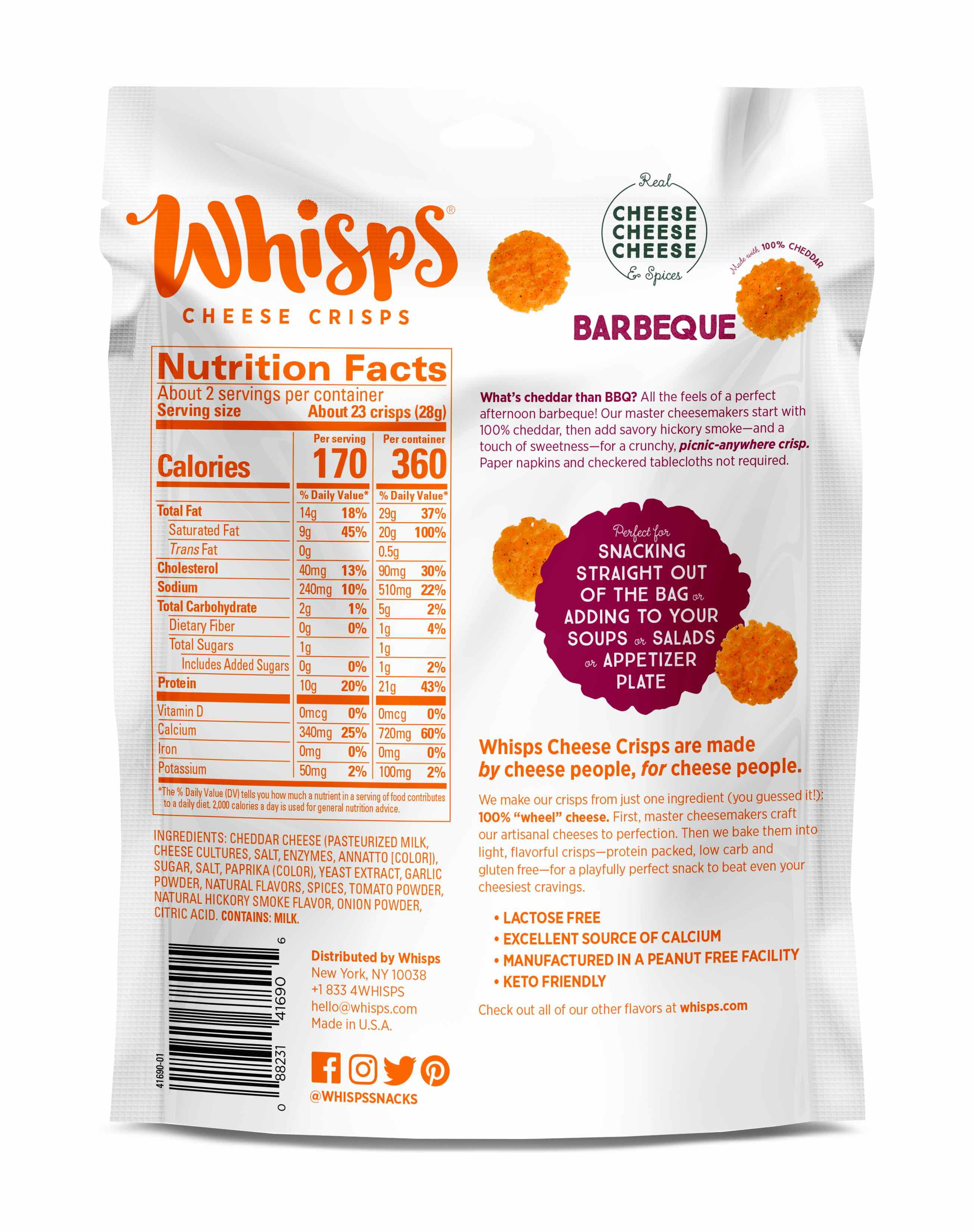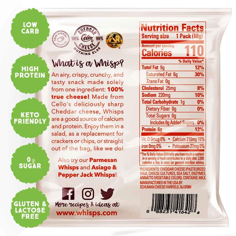 About Our Cheese: Whisps Ingredients and Nutritional Information All our cheese is responsibly sourced with fresh milk from local farms and cows that are never treated with growth hormones. Then it is expertly crafted and taste-tested by master cheesemakers and baked into delicious, healthy cheese snacks. < 3 grams Sugar Gluten Free Lactose Free* Keto Friendly Without Preservatives or Artificial Ingredients