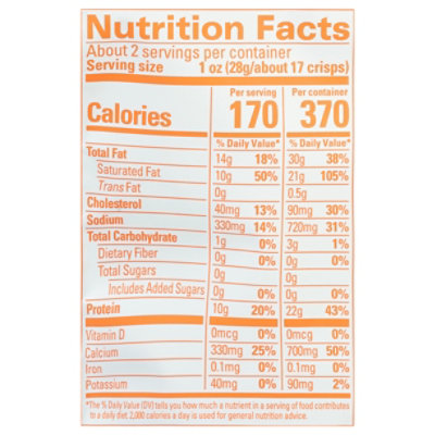 Whisps nutrition label. Calories in Whisps Cheddar Cheese Crisps and Nutrition Facts - FatSecret Calories. 170. Fat. 14g. Carbs. 1g. Protein. 10g. There are 170 calories in 23 crisps (28 g) of Whisps Cheddar Cheese Crisps. Chips | Costco - Costco Business Centre Terra Real Vegetable Chips Sweets Medley 453 g Item 1127643 Compare Product Whisps Tangy Ranch Cheese Crisps Macro Nutrition Facts [Food Label Data] Keto & Health Insights for Whisps Tangy Ranch Cheese Crisps. Net Carbs are 2% of calories per serving, at 3g per serving.This meal falls within the range for standard keto diet guidelines (at or under 25g of net carbs). If your daily net carb quota is 25g and if this food almost equals that much, consider whether you're going to eat more food later. Welcome to Costco Wholesale Oct 17, 2022 · Official website for Costsco Wholesale. Shop by departments, or search for specific item(s).