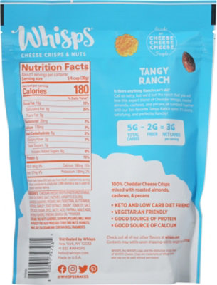 Whisps Tomato Basil Cheese Crisps Macro Nutrition Facts [Food Label Data] Nutritional information for Whisps Tomato Basil Cheese Crisps. Per 23 crisps (28g): 150 Calories | 11g Fat | 2g Carbohydrates | 1g Fiber | 0g Sugar | 12g Protein | 390mg Sodium | 35mg Cholesterol | 61mg Potassium.