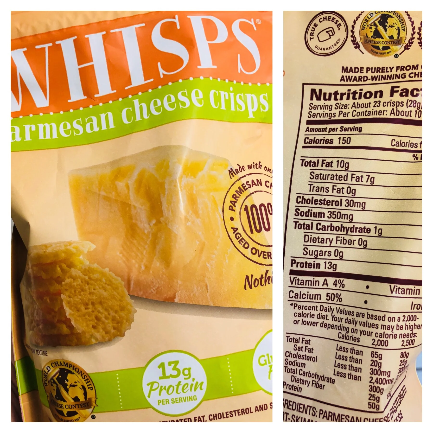 Calories in Whisps Parmesan Cheese Crisps and Nutrition Facts - FatSecret Whisps Parmesan Cheese Crisps Nutrition Facts Serving Size 19 crisps (28 g) Amount Per Serving Calories 150 % Daily Values* Total Fat 10.00g 13% Saturated Fat 7.000g 35% Trans Fat 0.000g Cholesterol 30mg 10% Sodium 350mg 15% Total Carbohydrate 1.00g 0% Dietary Fiber 0.0g 0% Sugars 0.00g Includes 0.00g Added Sugars 0% Protein 13.00g Vitamin D 0mcg