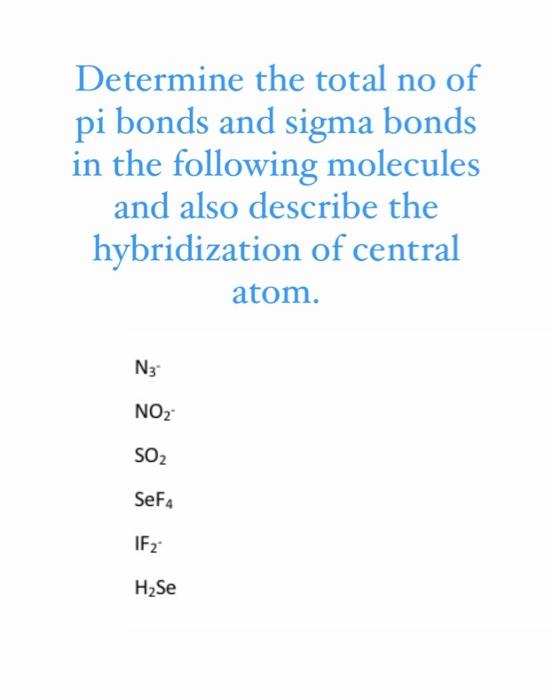How many pi bond in so2? - Answers SO2 has 2 sigma bonds because no matter what type of bond you have (triple, double, or single) each one is always equal to 1 sigma bond. Does so2 no2 co2 have pi bond? yes. all have... Pi Bond - Definition, Explanation, Examples with Illustrations - BYJUS Pi bonds are chemical bonds that are covalent in nature and involve the lateral overlapping of two lobes of an atomic orbital with two lobes of another atomic orbital that belongs to a different atom. Pi bonds are often written as '𝛑 bonds', where the Greek letter '𝛑' refers to the similar symmetry of the pi bond and the p orbital. How many pi bonds are there in "CO"_2? | Socratic Chemistry Molecular Orbital Theory Pi Bonds 1 Answer Stefan V. · Media Owl Jan 3, 2015 CO2 has 2 pi bonds. First, start with the molecule's Lewis structure, which allows you to determine the hybridization of each atom. We can see that C has two regions of electron density around it, which means it has a steric number equal to 2. 11 chap 4 | Chemical Bonding 07 | Pi Bond | P Pi - D Pi | P Pi - YouTube For PDF Notes and best Assignments visit @ Classes, Video Lectures, Test Series, Lecturewise notes, topicwise DPP, ...