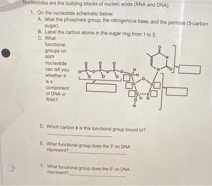 Draw a nucleotide. Label the phosphate, nitrogenous base, sugar ... Please see the image below, where the carbons of the sugar molecule are labelled 1-4.