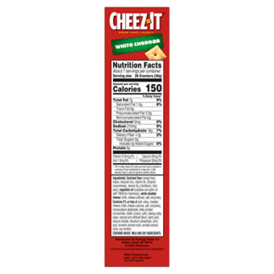 Cheez-It® Original | Cheez-It® Ingredients Ingredients: Enriched flour (wheat flour, niacin, reduced iron, vitamin B1 [thiamin mononitrate], vitamin B2 [riboflavin], folic acid), vegetable oil (high oleic soybean, soybean, palm, and/or canola oil with TBHQ for freshness), cheese made with skim milk (skim milk, whey protein, salt, cheese cultures, enzymes, annatto extract color). Cheez-It® Whole Grain Snack Crackers - SmartLabel™ Calories 1.5 g Sat Fat 230 mg Sodium 0 g Sugar Nutrition Facts Servings Per Container About 12 Serving Size 26 Crackers (29 g) *The % Daily Value (DV) tells you how much a nutrient in a serving of food contributes to a daily diet. 2,000 calories a day is used for general nutrition advice. Information last updated on 03-01-2023 by Kellogg's