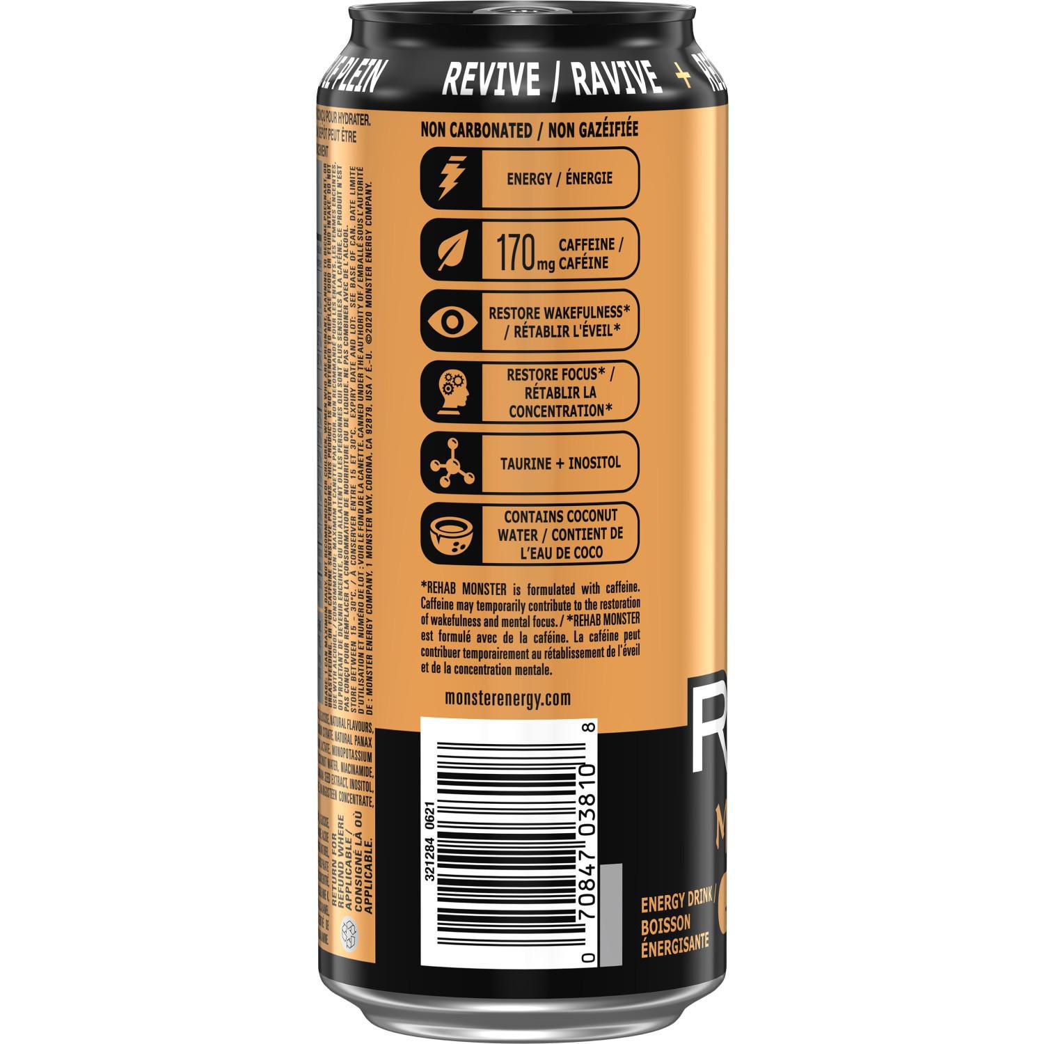 Rehab Monster Peach Tea - Monster Energy You crack open a Rehab Monster Peach Tea and let the peach-infused electrolytes, vitamins, and botanicals work their life-giving, hydration magic. Congrats, You're back from the dead. Flavour Profile: Brewed Peach Tea REFRESH + RECOVER + REVIVE Total Caffeine: 160 mg per can Consume Responsibly: